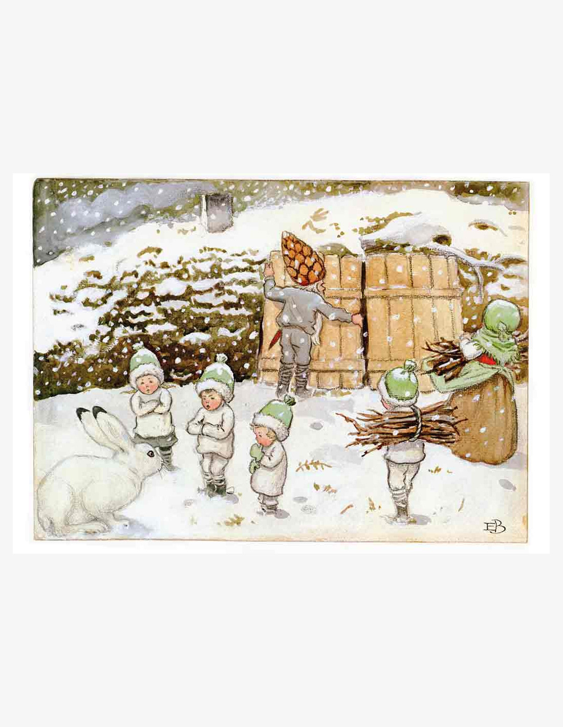 Elsa Beskowin satukuvituksen näköispainos. Kortin taustapuolella viivoitus osoitteelle. Tuote on valmistettu Suomessa korkealaatuisesta materiaalista.