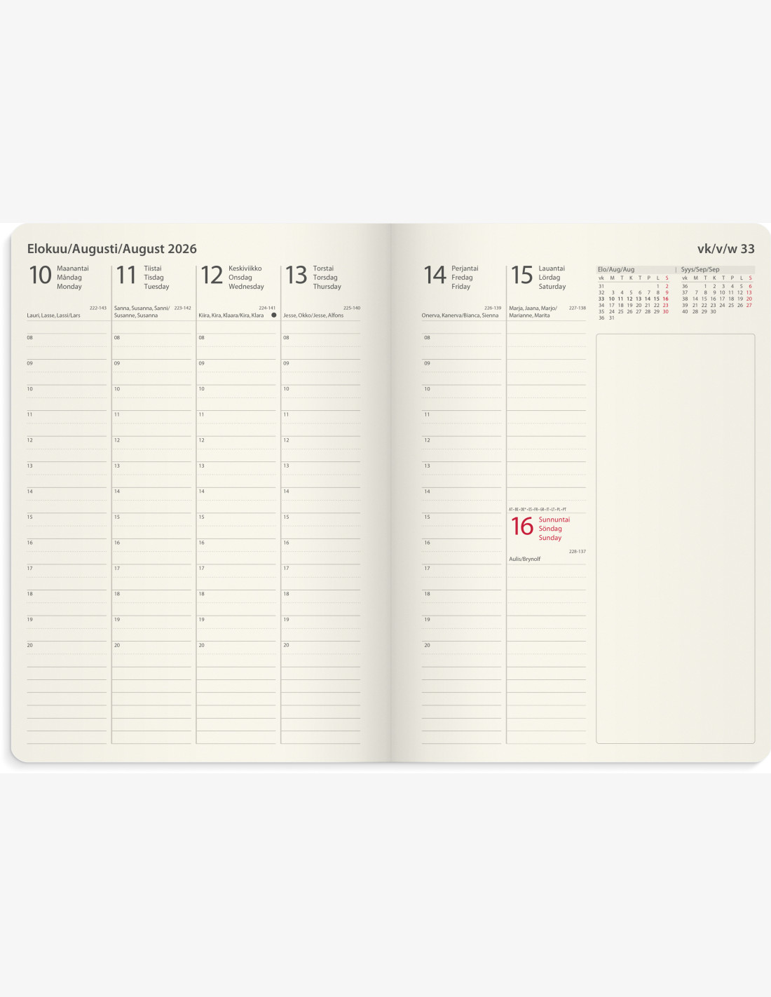 Kalenteriosa: vk 52 2025-vk 53 2026/2027. Kolmikielinen: suomi/ruotsi/englanti. Sidottu. Kermanvärinen paperi. FSC®-paperi. Koko: 148x210 mm (A5).