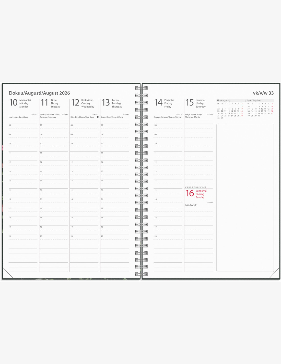 Kalenteriosa: vk 48 2025-vk 53 2026/2027. Kolmikielinen: suomi/ruotsi/englanti. Parikierresidottu. FSC®. Koko: 148x210 mm (A5).