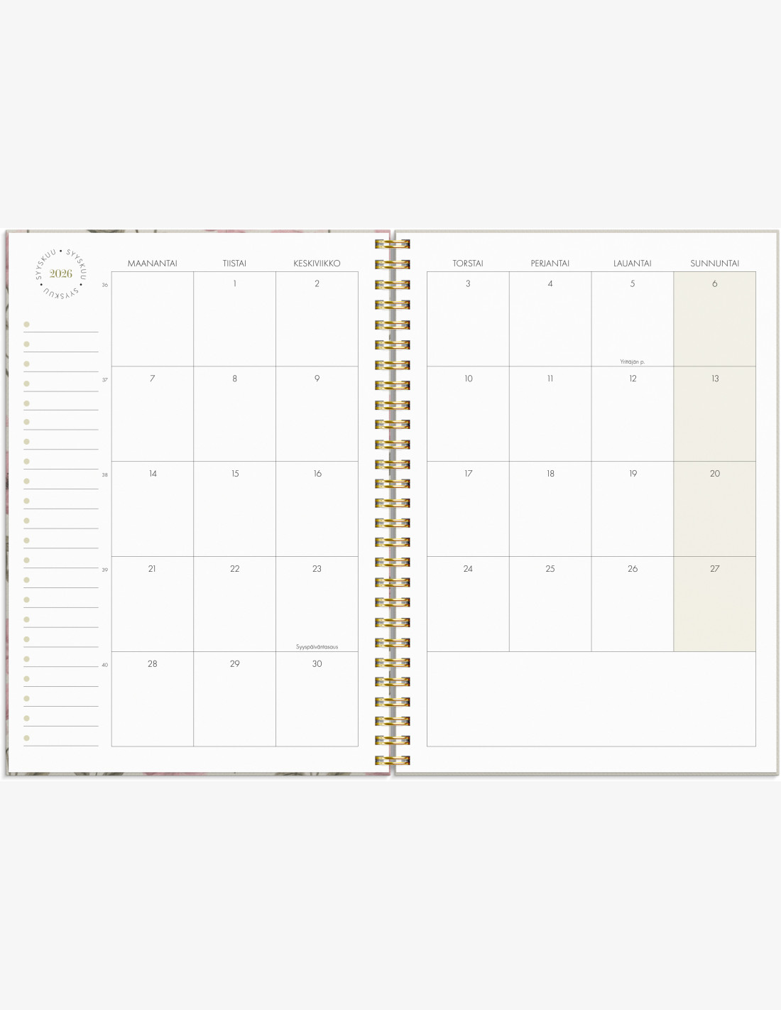 Kalenteriosa: vk 51 2025 – v 53 2026/2027. Suomenkielinen. Parikierresidottu. FSC®. Koko: 148x210 mm (A5).