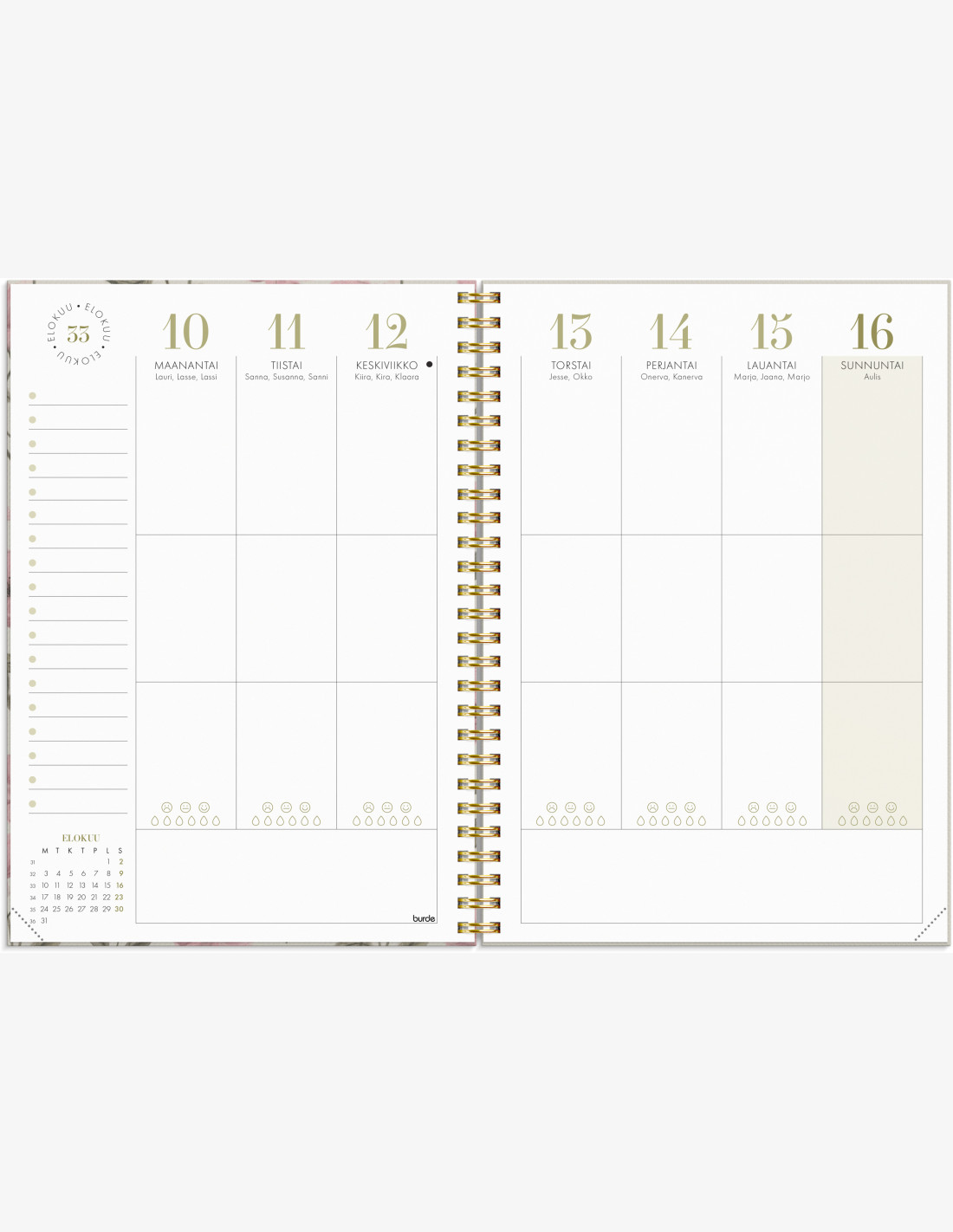 Henkilökohtainen kalenteri, joka keskittyy hyvinvointiisi ja tasapainoosi ja jossa on erilaisia työkaluja viikkosuunnitteluun. Luo oma ainutlaatuinen kalenterisi tarra-arkin avulla ja keskity siihen, mikä tekee sinulle hyvää.