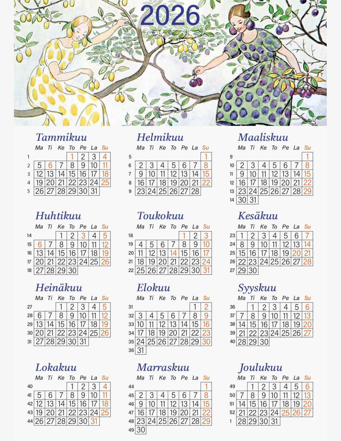 Elsa Beskow kalenteripostikortti, jossa on vuoden 2026 kuukaudet ja pyhäpäivät. Kortin taustapuolella viivoitus osoitteelle. Tuote on valmistettu Suomessa korkealaatuisesta materiaalista.