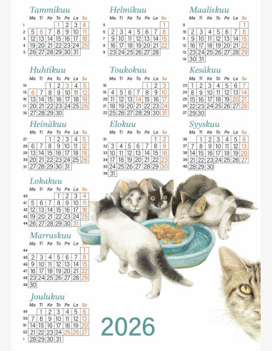Marjolein Bastin kalenteripostikortti, jossa on vuoden 2026 kuukaudet ja pyhäpäivät. Kortin taustapuolella viivoitus osoitteelle. Tuote on valmistettu Suomessa korkealaatuisesta materiaalista.