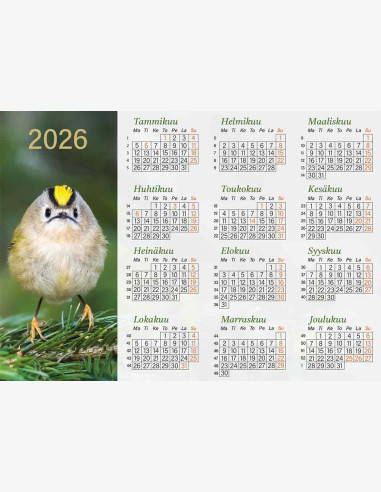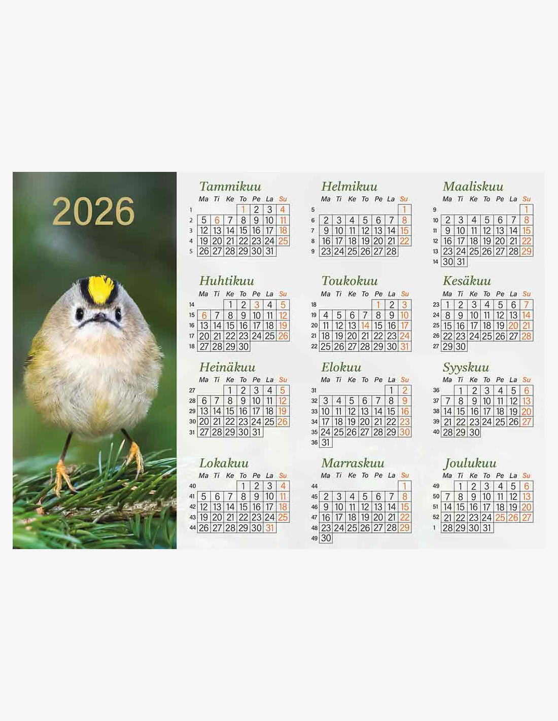 Ossi Saarinen - Hippiäinen kalenteripostikortti, jossa on vuoden 2026 kuukaudet ja pyhäpäivät. Kortin taustapuolella viivoitus osoitteelle. Tuote on valmistettu Suomessa korkealaatuisesta materiaalista.
