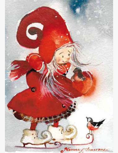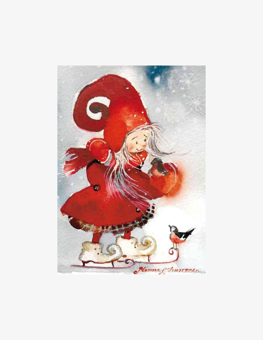 Kortin tekstipuolella esipainettu joulutervehdys suomeksi, ruotsiksi ja englanniksi.