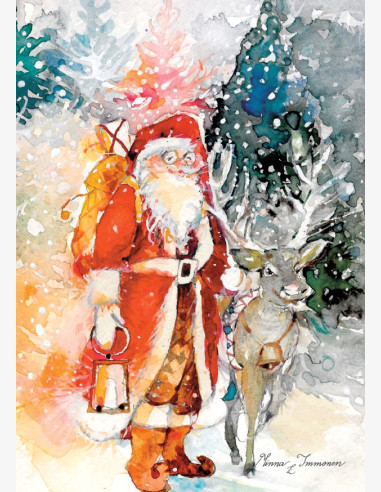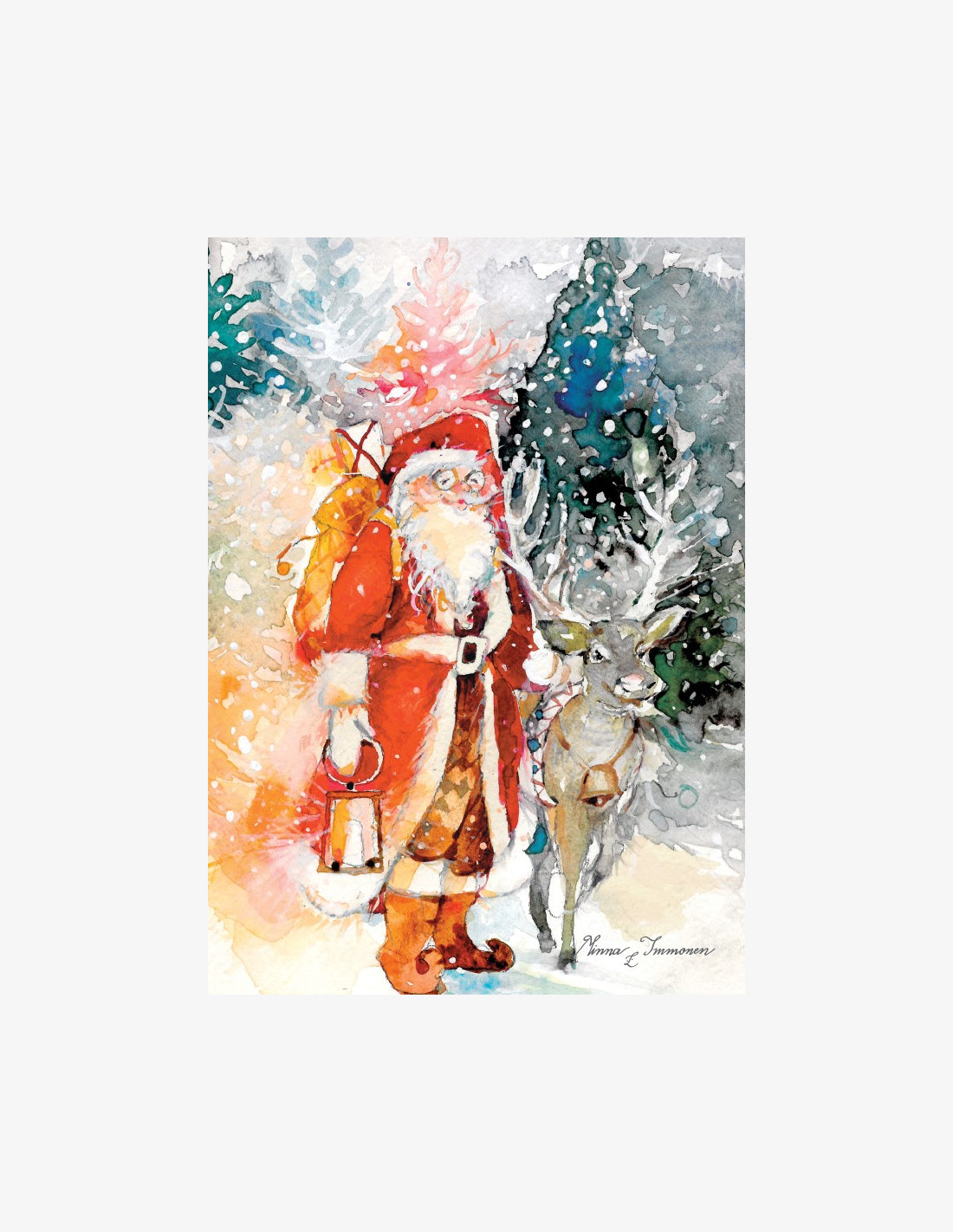 Kortin tekstipuolella esipainettu joulutervehdys suomeksi, ruotsiksi ja englanniksi.