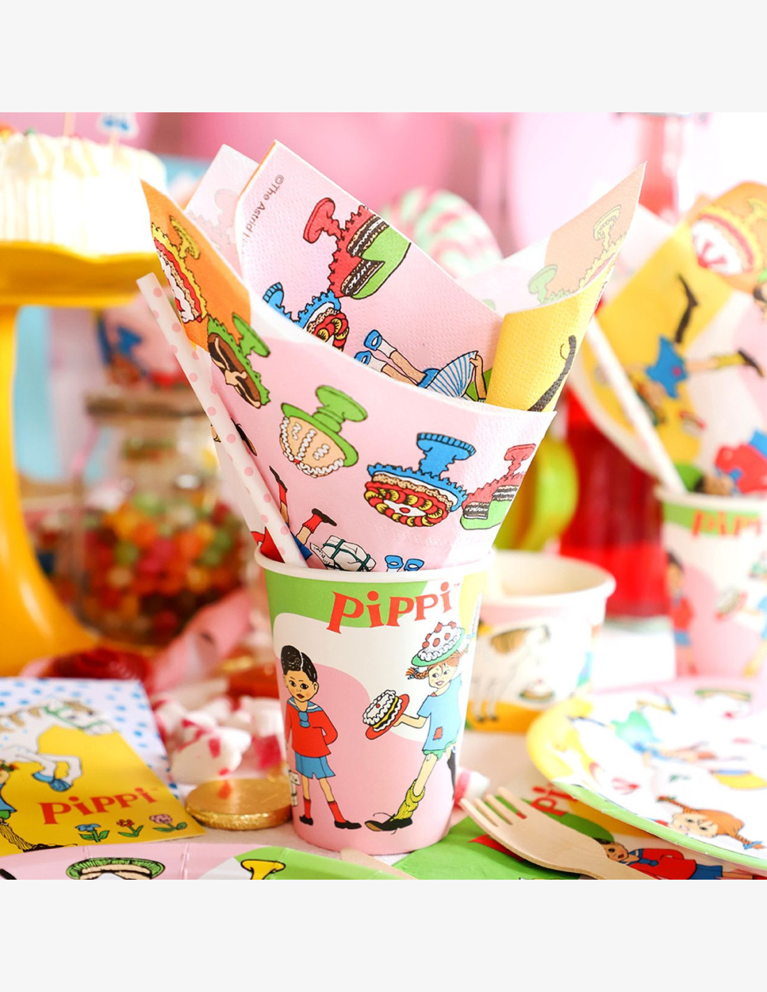 Pakkauksessa on yhtä kuva-aihetta, yhteensä 8 kpl. Sopii yhteen muiden Peppi Pitkätossu juhlatuotteiden kanssa. Huomiona, että tuotteissa Peppi Pitkätossu ruotsinkielellä Pippi.