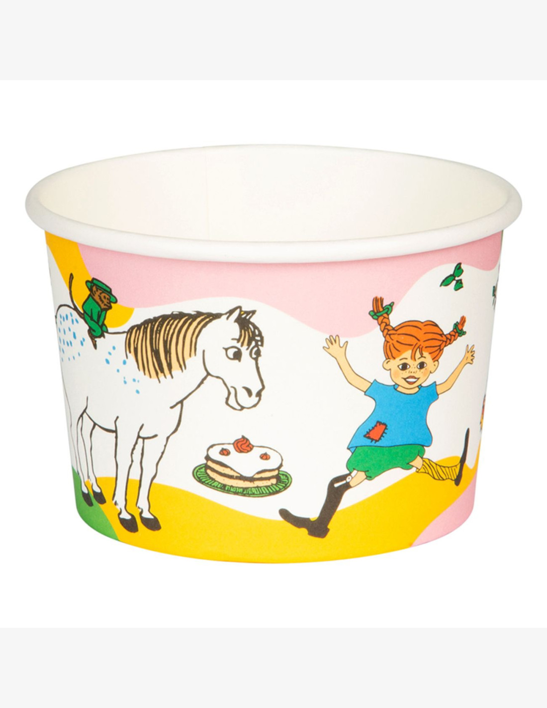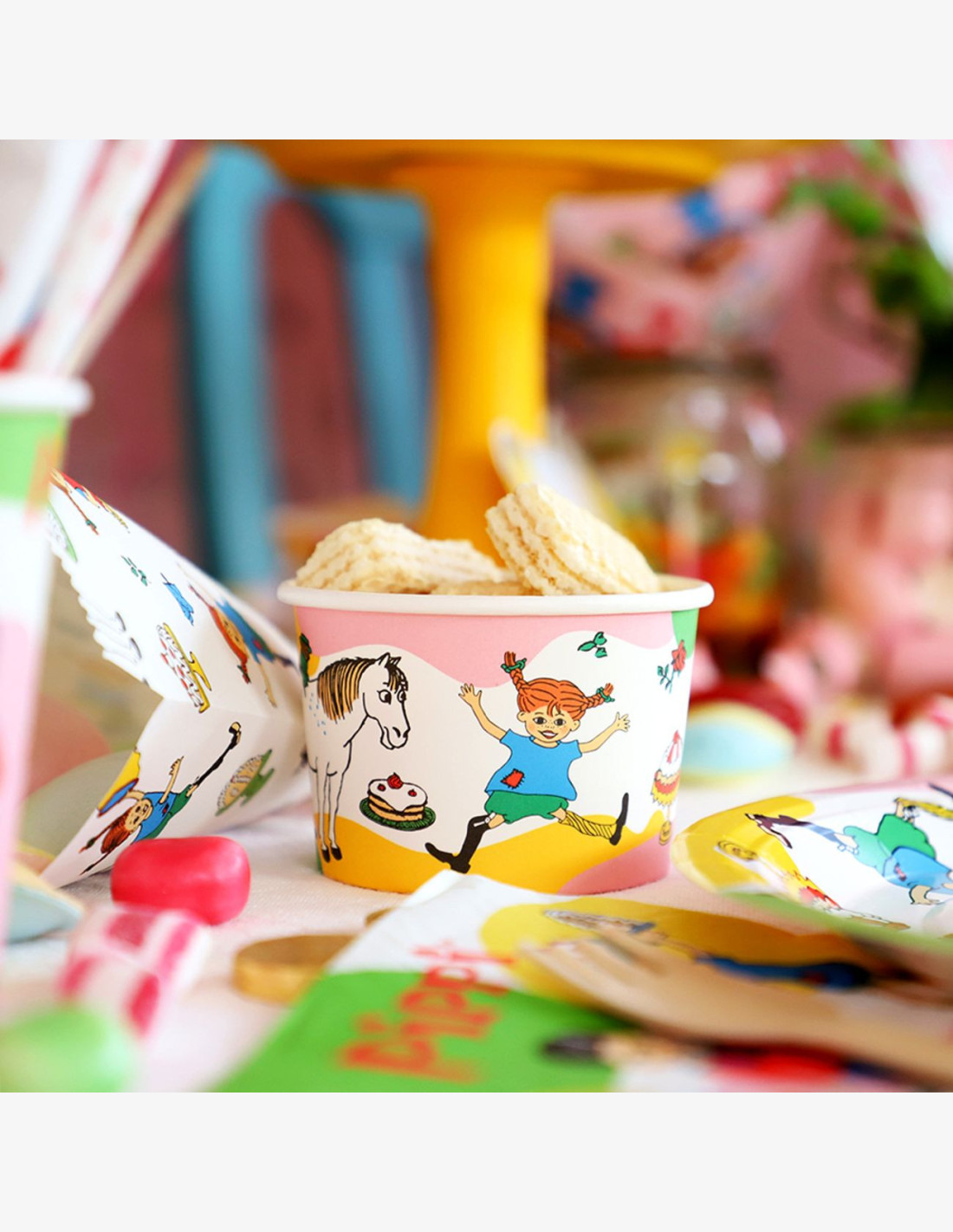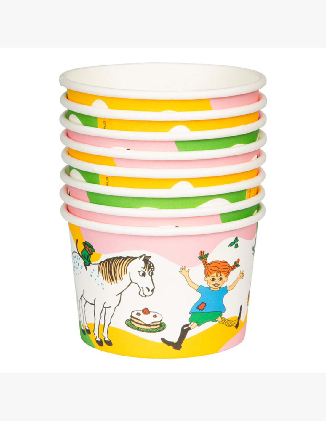 Jäätelökupit, jossa kuvituksena Astrid Lindgrenin Peppi Pitkätossu. Pakkauksessa on yhtä kuva-aihetta, yhteensä 8 kpl. Sopii yhteen muiden Peppi Pitkätossu juhlatuotteiden kanssa.