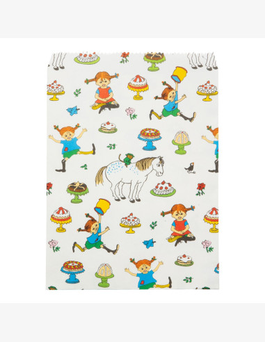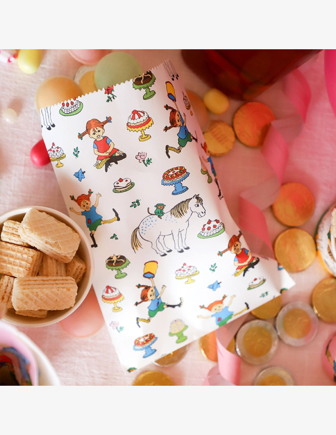 Juhlapussit, jossa kuvituksena Astrid Lindgrenin Peppi Pitkätossu. Pakkauksessa on yhtä kuva-aihetta, yhteensä 8 kpl. Sopii yhteen muiden Peppi Pitkätossu juhlatuotteiden kanssa.