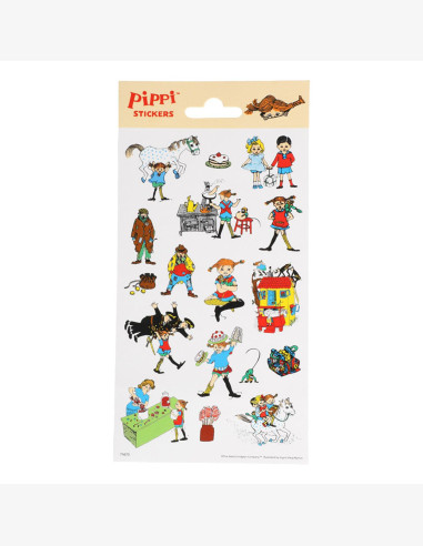 Tarra-arkki, jossa kuvituksena Astrid Lindgrenin Peppi Pitkätossu. Pakkauksessa on yksi tarra-arkki, jossa on 17 tarraa. Sopii yhteen muiden Peppi Pitkätossu juhlatuotteiden kanssa.