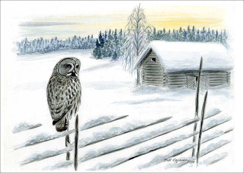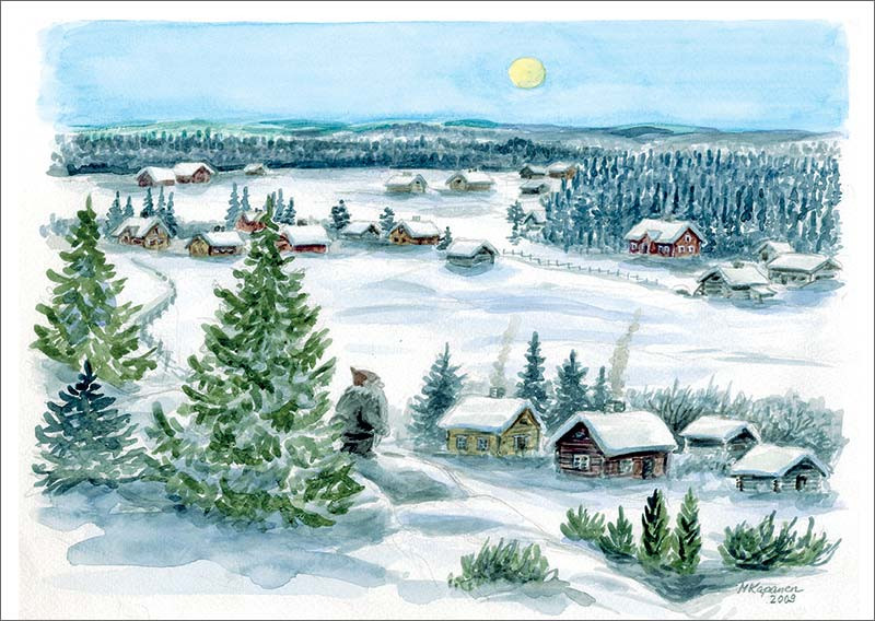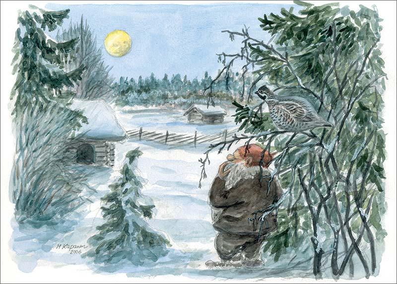 Matti Kapanen -joulukortti - Tonttu, hömötiaiset ja lapintiainen