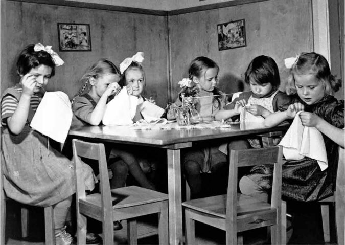 Tytöt vohvelikangaspyyhkeitä kirjailemassa, 1952