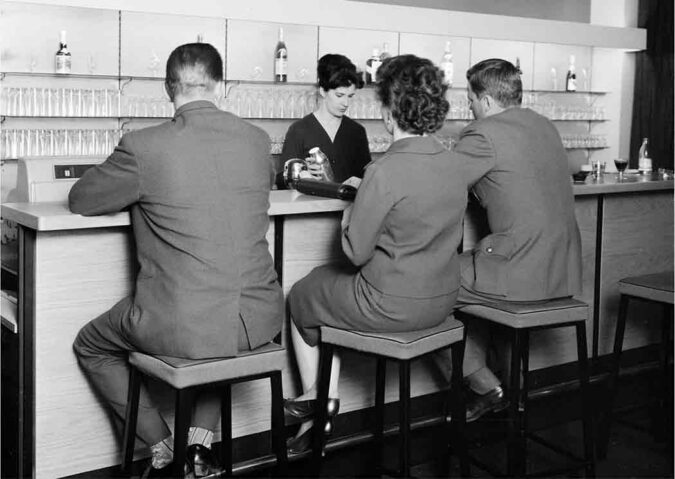 Baarimestari sekoittaa juomia asiakkaille, 1963