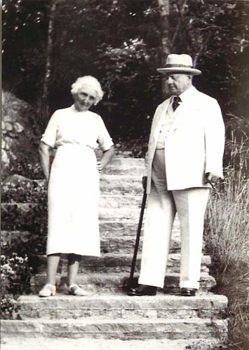 Aino ja Jean Sibelius Ainolan puutarhan portailla.