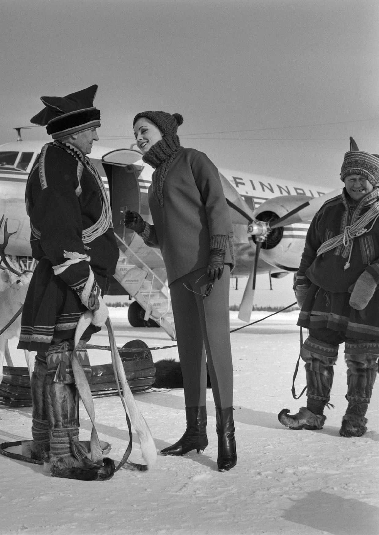 Lappi-teema näkyy Aero Oy:n mainoskuvauksessa Oulun lentokentällä 16.3.1962.