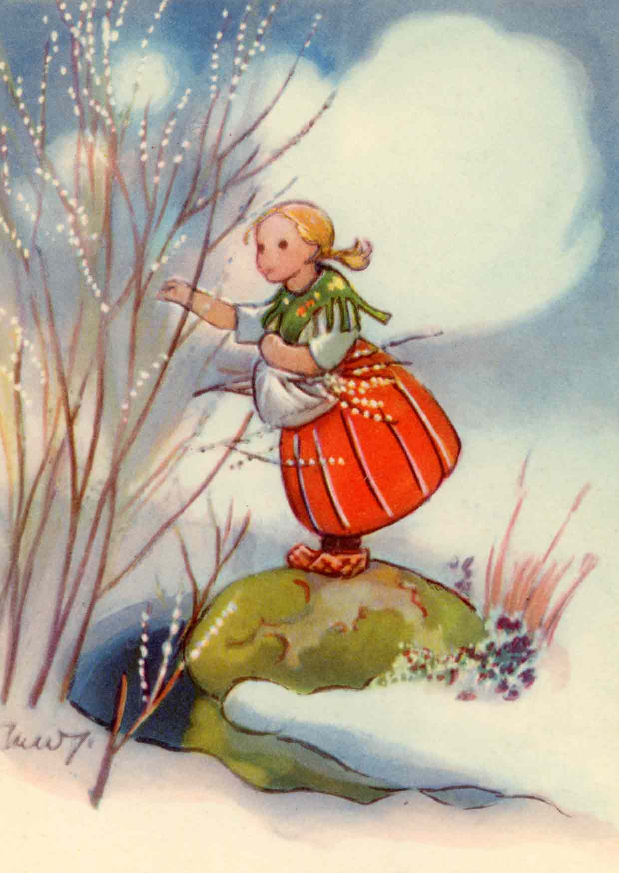 Martta Wendelin 1893-1986, taidemaalari ja kuvittaja, suomalaisen postikortin klassikko. Kortin taustapuolella viivoitus osoitteelle. Tuote on valmistettu Suomessa korkealaatuisesta materiaalista.