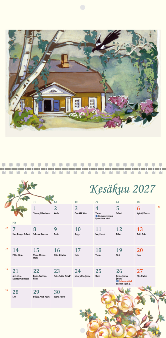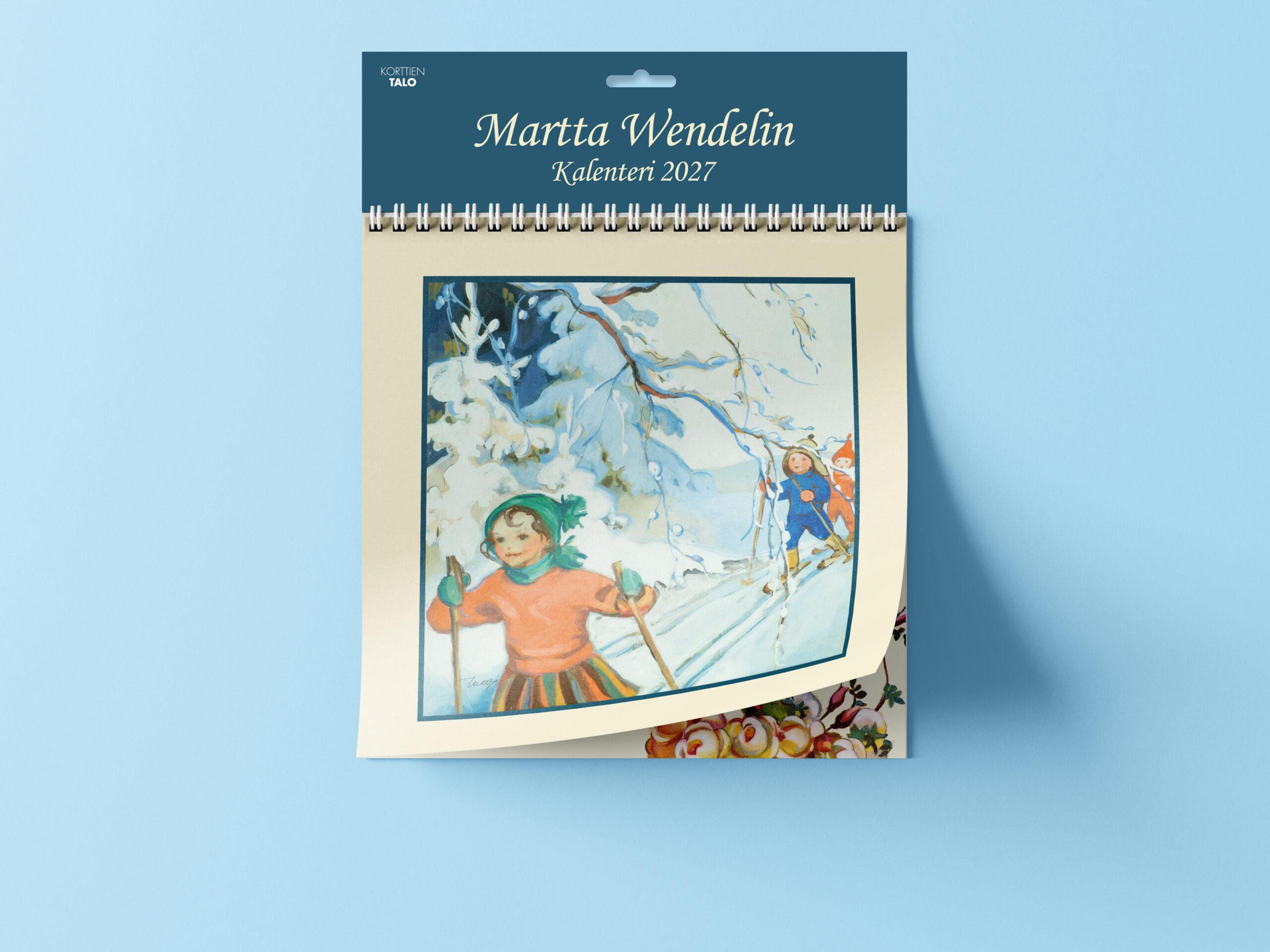 Martta Wendelin -seinäkalenteri vuodelle 2027. Kalenterissa on suomenkieliset nimipäivät, juhlapäivät, sekä liputuspäivät. Kalenterin koko suljettuna 20,5 x 20,5 cm (avattuna leveys 20,5 ja korkeus 41 cm). Metallinen kierresidonta.