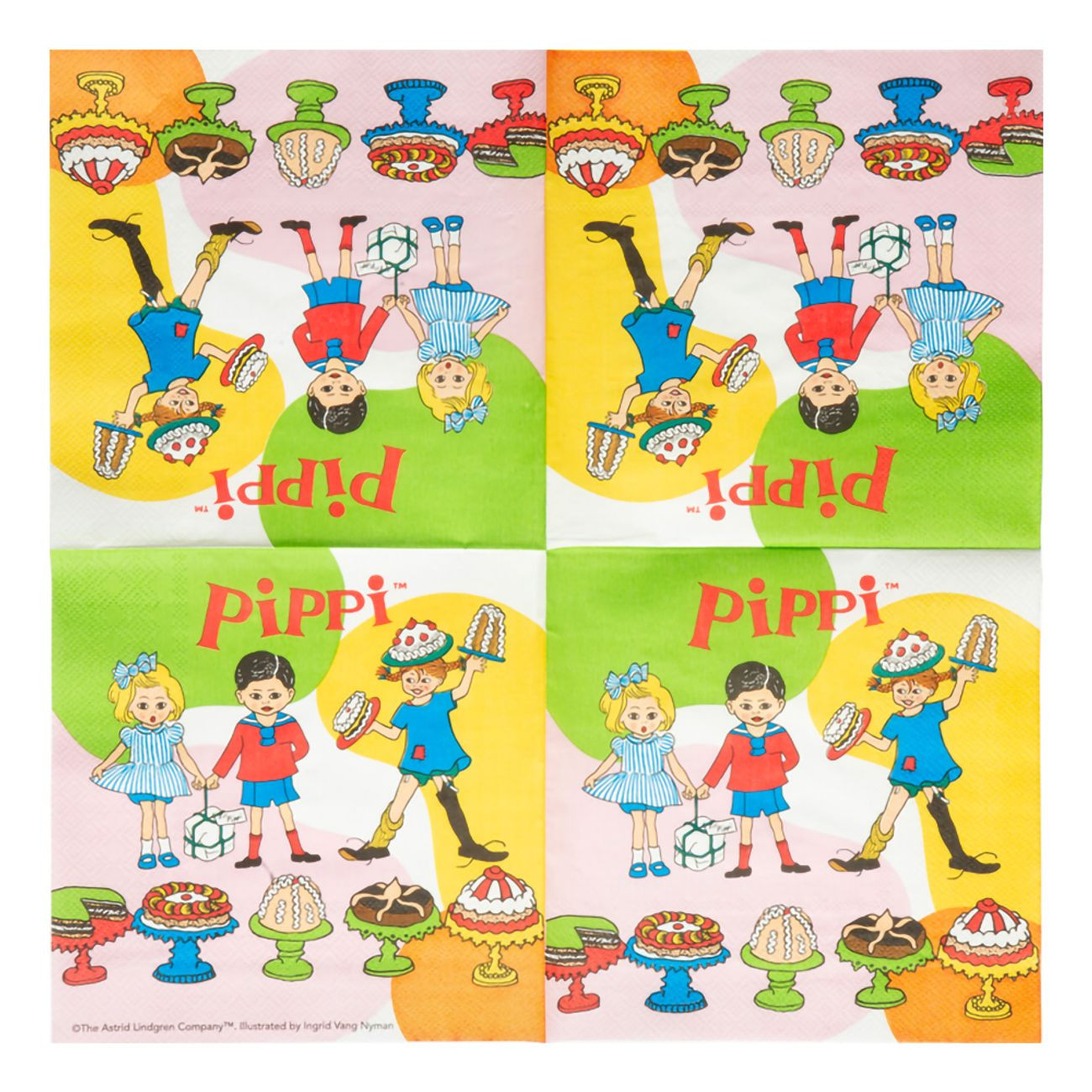 Servetit, jossa kuvituksena Astrid Lindgrenin Peppi Pitkätossu. Pakkauksessa on servettejä yhteensä 16 kpl. Sopii yhteen muiden Peppi Pitkätossu juhlatuotteiden kanssa. Huomiona, että tuotteissa Peppi Pitkätossu ruotsinkielellä Pippi.