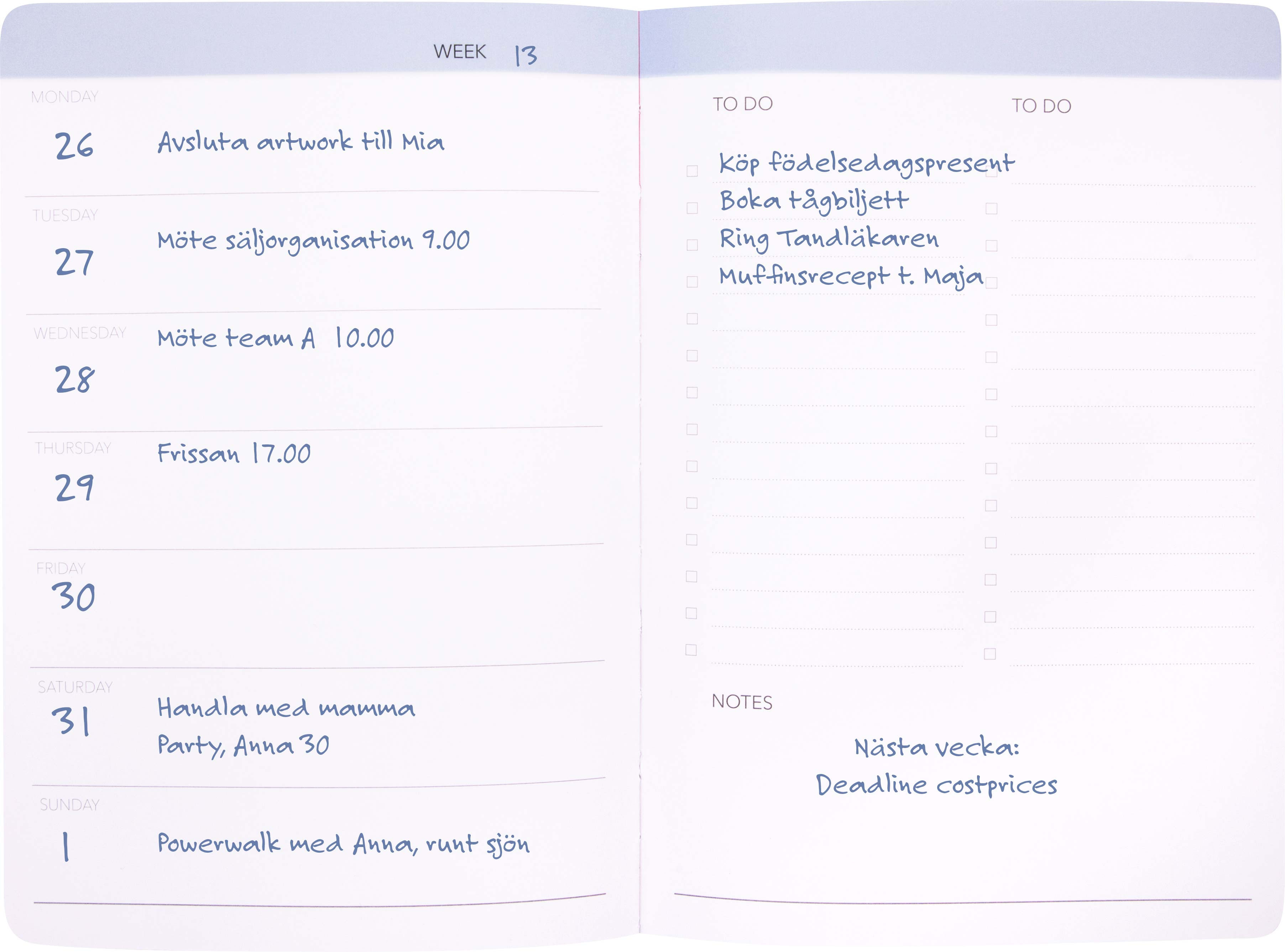 Koko: A5. Layout: Viikko/aukeama. Vaakasuora. Kansi: Kartonki. Sidottu. Yksityiskohta: Kuminauha. Merkkinauha. Paperitasku. Sivujen määrä: 256. Paperin paino: 90 g. Luontoystävällisyys: FSC®. Tavaramerkki: Burde.